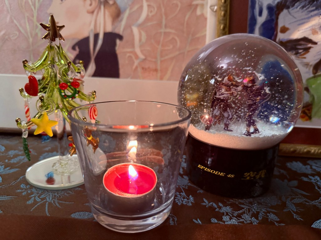 12/18、寝る前にガラスのミニツリーとクウガのスノードームを(やっと)出してきて、クリスマスっぽいことをしました。キャンドルさえあればだいたいどうにかなる(笑)。